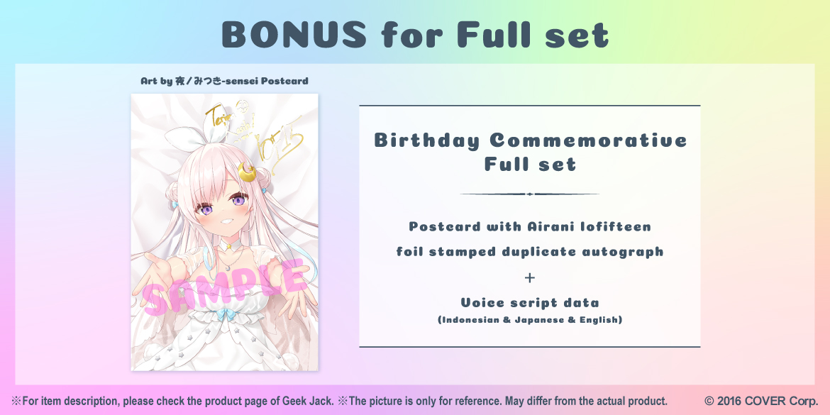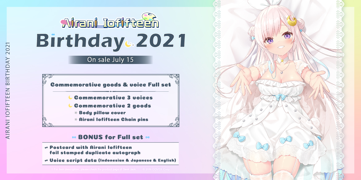 Who is Airani Iofifteen? Product list Airani Iofifteen "Airani Iofifteen Birthday 2021" Commemorative goods & voice complete pack JPY11,500 Airani Iofifteen "Airani Iofifteen Birthday 2021" Commemorative voice pack JPY2,100 Airani Iofifteen "Airani Iofifteen Birthday 2021" Commemorative Body pillow cover JPY7,000 Airani Iofifteen "Airani Iofifteen Birthday 2021" Chain pins JPY2,400 Airani Iofifteen "Airani Iofifteen Birthday 2021" Situation voice [Date at the Aquarium with Iofi]English JPY700 Airani Iofifteen "Airani Iofifteen Birthday 2021" Situation voice [In the rain… with Iofi]Indonesian JPY700 Airani Iofifteen "Airani Iofifteen Birthday 2021" [At home… with Iofi♡]Japanese JPY700 Airani Iofifteen Situation voice set(Japanese) JPY1,000 Airani Iofifteen Situation voice/A surprise to Iofi(Japanese) JPY500 Airani Iofifteen Situation voice/Iofi dare not go to the toilet alone at night when traveling with you(Japanese) JPY500 Airani Iofifteen Situation voice set(Indonesian) JPY1,000 Airani Iofifteen Situation voice/Wake up with you when living together(Indonesian) JPY500 Airani Iofifteen Situation voice/Cooking with you when living together(Indonesian) JPY500 Airani Iofifteen Alarm voice set(Japanese) JPY400 Airani Iofifteen Alarm voice/Tsundere Iofi(Japanese) JPY200 Airani Iofifteen Alarm voice/Super sadist Iofi(Japanese) JPY200 Airani Iofifteen Indonesian lullaby "Nina Bobo" A cappella JPY200