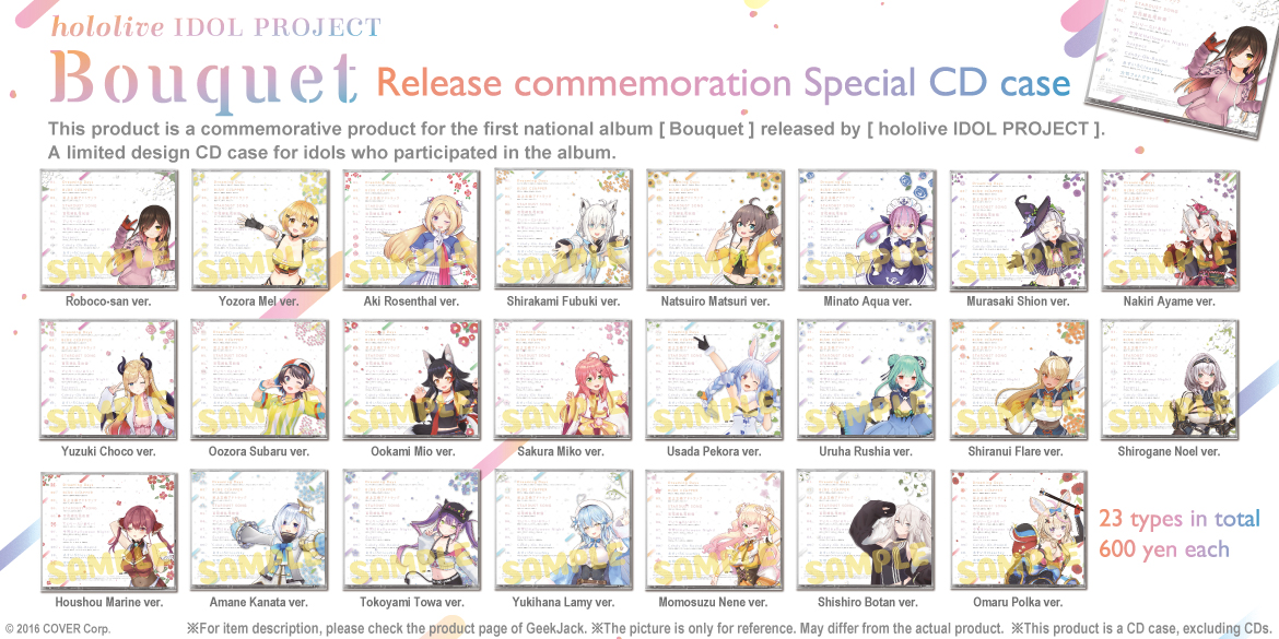 Product list Robocosan hololive IDOL PROJECT "Bouquet" Release commemoration Special CD case [Roboco-san] JPY600 Yozora Mel hololive IDOL PROJECT "Bouquet" Release commemoration Special CD case [Yozora Mel] JPY600 Aki Rosenthal hololive IDOL PROJECT "Bouquet" Release commemoration Special CD case [Aki Rosenthal] JPY600 Shirakami Fubuki hololive IDOL PROJECT "Bouquet" Release commemoration Special CD case [Shirakami Fubuki] JPY600 Natsuiro Matsuri hololive IDOL PROJECT "Bouquet" Release commemoration Special CD case [Natsuiro Matsuri] JPY600 Minato Aqua hololive IDOL PROJECT "Bouquet" Release commemoration Special CD case [Minato Aqua] JPY600 Murasaki Shion hololive IDOL PROJECT "Bouquet" Release commemoration Special CD case [Murasaki Shion] JPY600 Nakiri Ayame hololive IDOL PROJECT "Bouquet" Release commemoration Special CD case [Nakiri Ayame] JPY600 Yuzuki Choco hololive IDOL PROJECT "Bouquet" Release commemoration Special CD case [Yuzuki Choco] JPY600 Oozora Subaru hololive IDOL PROJECT "Bouquet" Release commemoration Special CD case [Oozora Subaru] JPY600 Ookami Mio hololive IDOL PROJECT "Bouquet" Release commemoration Special CD case [Ookami Mio] JPY600 Sakuramiko hololive IDOL PROJECT "Bouquet" Release commemoration Special CD case [Sakur Miko] JPY600 Usada Pekora hololive IDOL PROJECT "Bouquet" Release commemoration Special CD case [Usada Pekora] JPY600 Uruha Rushia hololive IDOL PROJECT "Bouquet" Release commemoration Special CD case [Uruha Rushia] JPY600 Shiranui Flare hololive IDOL PROJECT "Bouquet" Release commemoration Special CD case [Shiranui Flare] JPY600 Shirogane Noel hololive IDOL PROJECT "Bouquet" Release commemoration Special CD case [Shirogane Noel] JPY600 Houshou Marine hololive IDOL PROJECT "Bouquet" Release commemoration Special CD case [Houshou Marine] JPY600 Amane Kanata hololive IDOL PROJECT "Bouquet" Release commemoration Special CD case [Amane Kanata] JPY600 Tokoyami Towa hololive IDOL PROJECT "Bouquet" Release commemoration Special CD case [Tokoyami Towa] JPY600 Yukihana Lamy hololive IDOL PROJECT "Bouquet" Release commemoration Special CD case [Yukihana Lamy] JPY600 Momosuzu Nene hololive IDOL PROJECT "Bouquet" Release commemoration Special CD case [Momosuzu Nene] JPY600 Shishiro Botan hololive IDOL PROJECT "Bouquet" Release commemoration Special CD case [Shishiro Botan] JPY600 Omaru Polka hololive IDOL PROJECT "Bouquet" Release commemoration Special CD case [Omaru Polka] JPY600