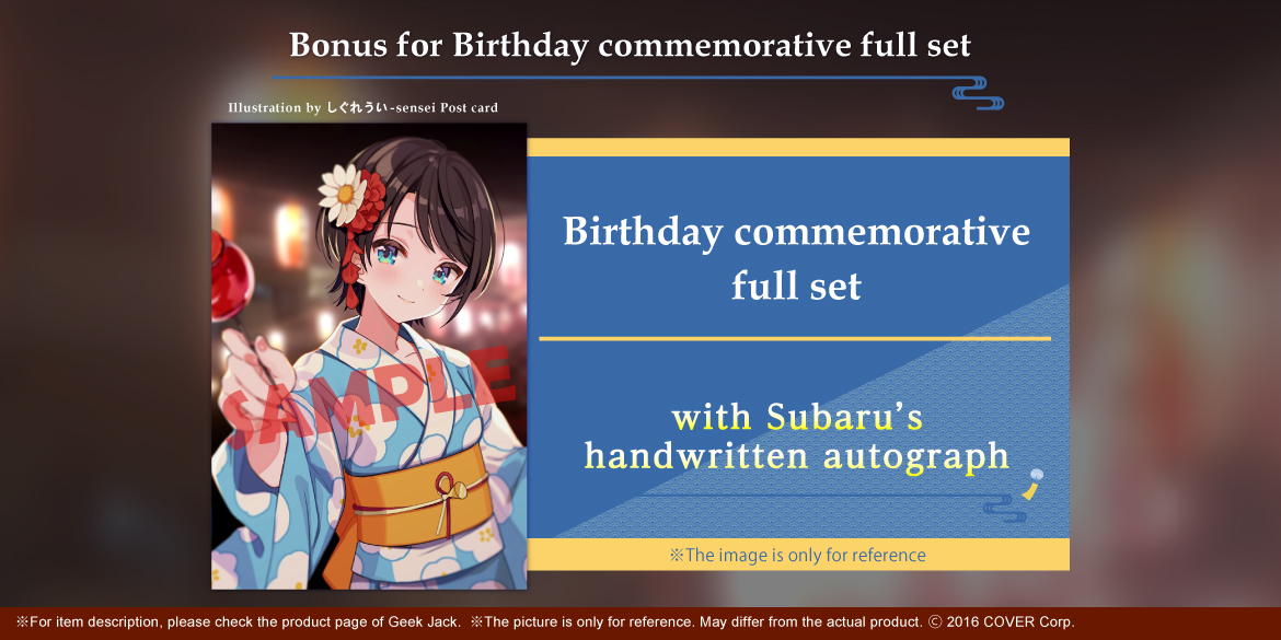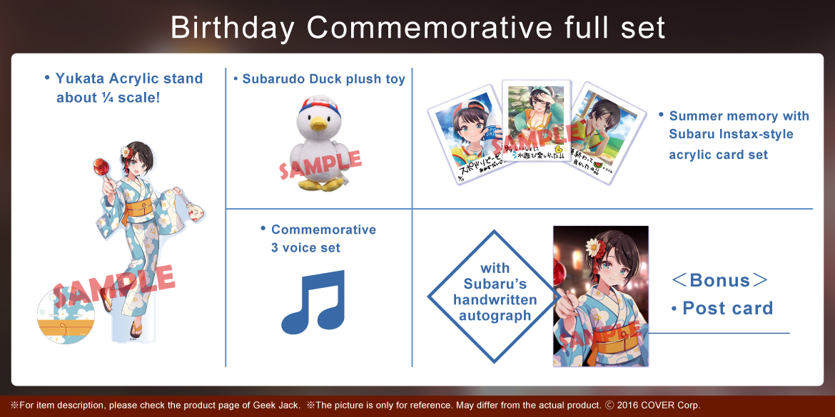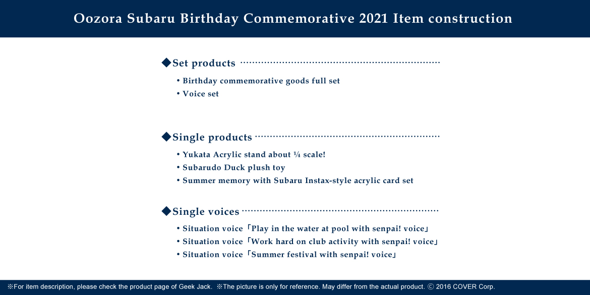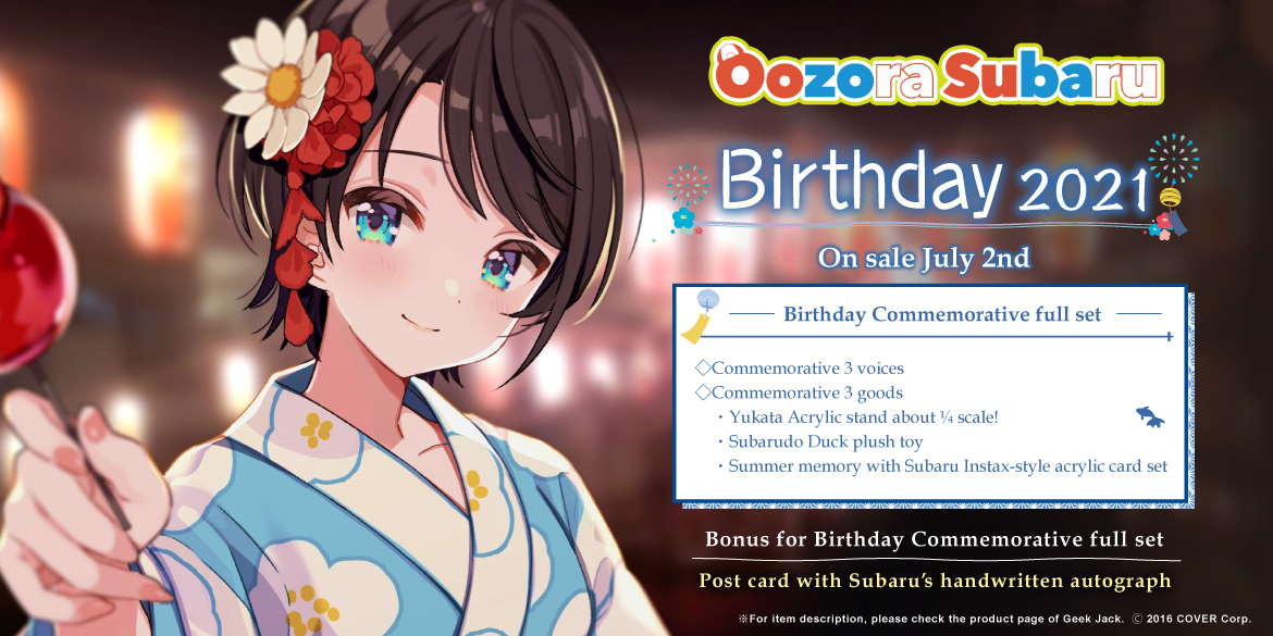 Who is Oozora Subaru? Product list Oozora Subaru "Oozora Subaru Birthday 2021" Commemorative full set JPY10,000 Oozora Subaru "Oozora Subaru Birthday 2021" Commemorative voice set JPY3,000 Oozora Subaru "Oozora Subaru Birthday 2021" Yukata Acrylic stand about ¼ scale! JPY5,000 Oozora Subaru "Oozora Subaru Birthday 2021" Subarudo Duck plush toy JPY3,000 Oozora Subaru "Oozora Subaru Birthday 2021" Summer memory with Subaru Instax-style acrylic card set JPY1,000 Oozora Subaru "Oozora Subaru Birthday 2021" Situation voice「Play in the water at pool with senpai! Voice」 JPY1,000 Oozora Subaru "Oozora Subaru Birthday 2021" Situation voice「Work hard on club activity with senpai! Voice」 JPY1,000 Oozora Subaru "Oozora Subaru Birthday 2021" Situation voice「Summer festival with senpai! Voice」 JPY1,000 Oozora Subaru "One-on-one talk event with Ozora Subaru! Commemorative goods" ASMR voice set JPY500 Oozora Subaru Oozora Subaru's Birthday Voice 2020 Full Set (with sepecial voice) JPY8,000 Oozora Subaru Birthday situation voice set JPY2,500 Oozora Subaru Situation voice set JPY2,500 Oozora Subaru System voice set JPY1,000 Oozora Subaru Short voice set JPY1,000 Oozora Subaru Alarm Voice Set (2 types) JPY1,000 Oozora Subaru "One-on-one talk event with Ozora Subaru! Commemorative goods" B2-size tapestry drawn by Shigure Ui-sensei JPY3,000